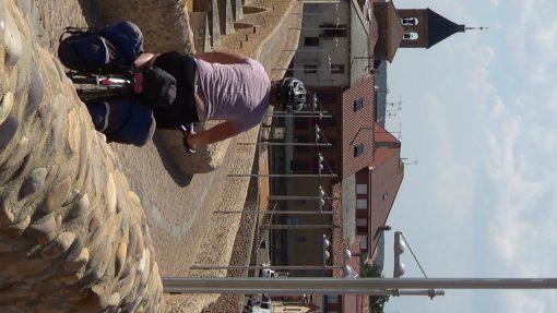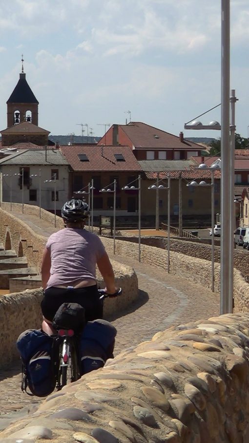 Bicycle pilgrims on the bridge Puente de Orbigo in the village Hospital de Orbigo. The Camino de Santiago (St. James Pilgrims Trail) is UNESCO World Cultural Heritage Site.