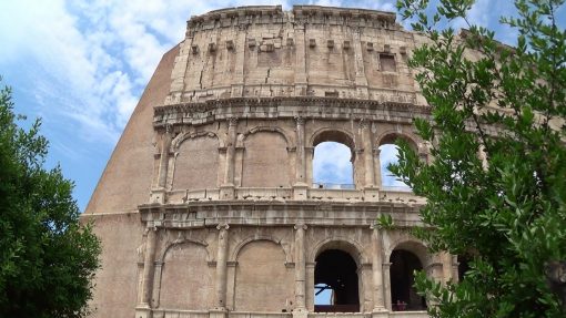 The Colosseo, seen from the street. UNESCO World Cultural Heritage Site. This is a tilt up.