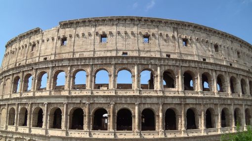 The Colosseo, street front. UNESCO World Cultural Heritage Site. This is a tilt up.