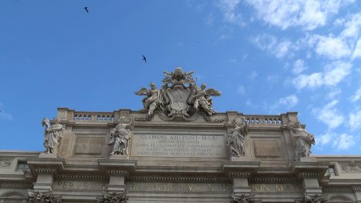 Clouds and birds over Fontana di Trevi (Trevi Fountain) in the Centro Storico (Old Town). UNESCO World Cultural Heritage Site.