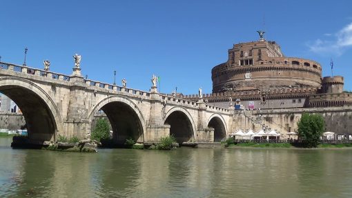 Ponte Sant’Angelo (Bridge of the Holy Angel) and Castel Sant’Angelo (Castle of the Holy Angel). UNESCO World Cultural Heritage Site. This is a panorama from the left to the right.