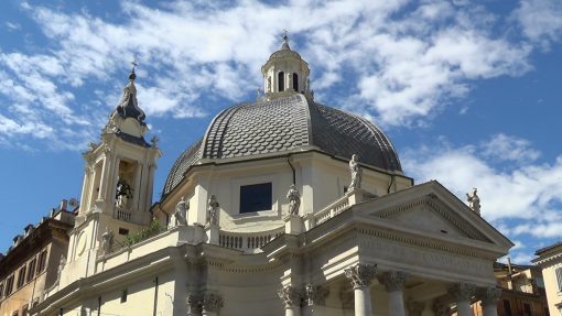 Sky and clouds over Santa Maria dei Miracoli on Piazza del Popolo. The cloud speed is accelerated.