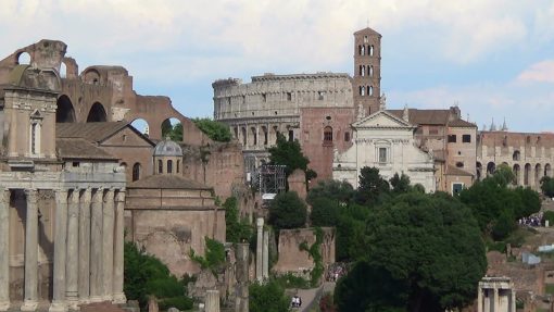 Forum Romanum, seen from the Campidoglio. UNESCO World Cultural Heritage Site. This is a zoom in. The Arco di Settimo Severo and the Tempio di Saturno in the foreground. The Colosseum in the distance.