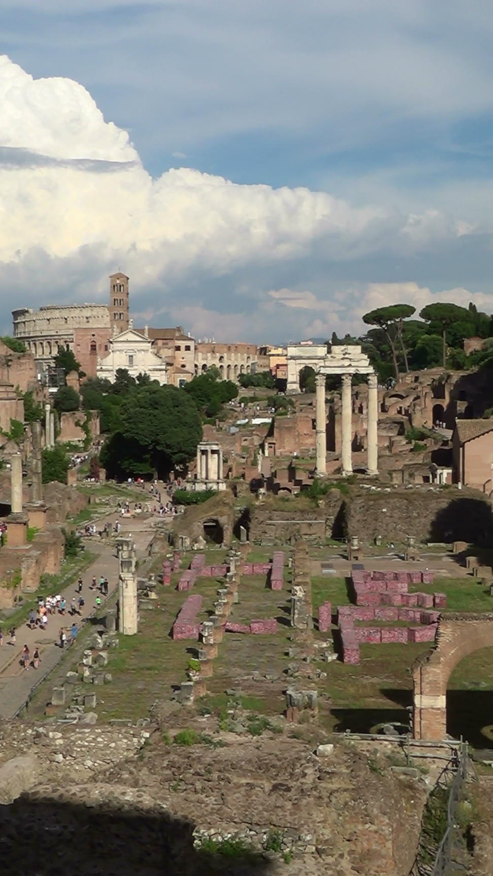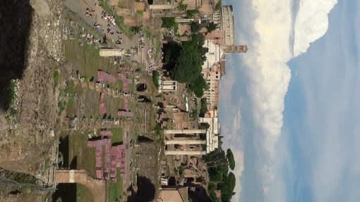 Forum Romanum, seen from the Campidoglio. UNESCO World Cultural Heritage Site. This is a panorama from the left to the right. From left to right the firewall of the Tabularium, the Chiesa dei Santi Luca e Martina, the Tempio di Saturno, the Arco di Settimo Severo, the Via Sacra, the Palatino. Colosseum in the distance.