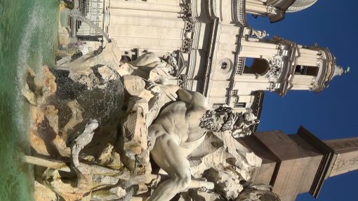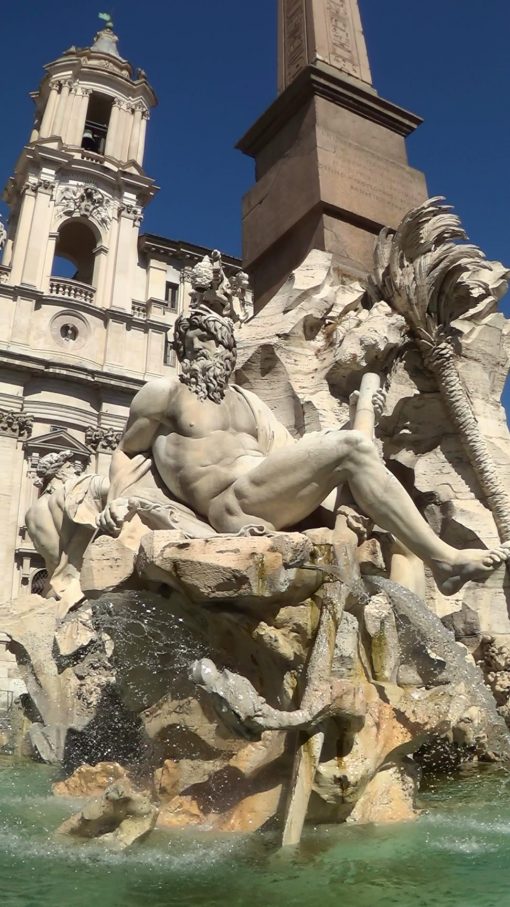 Fontana dei Quattro Fiumi (Fountain of the Four Rivers) on Piazza Navona. The four sculptures on the fountain stand for the rivers Danube, Ganges, Nile, and the Rio de la Plata. UNESCO World Cultural Heritage Site. This is a panorama from the right to the left.
