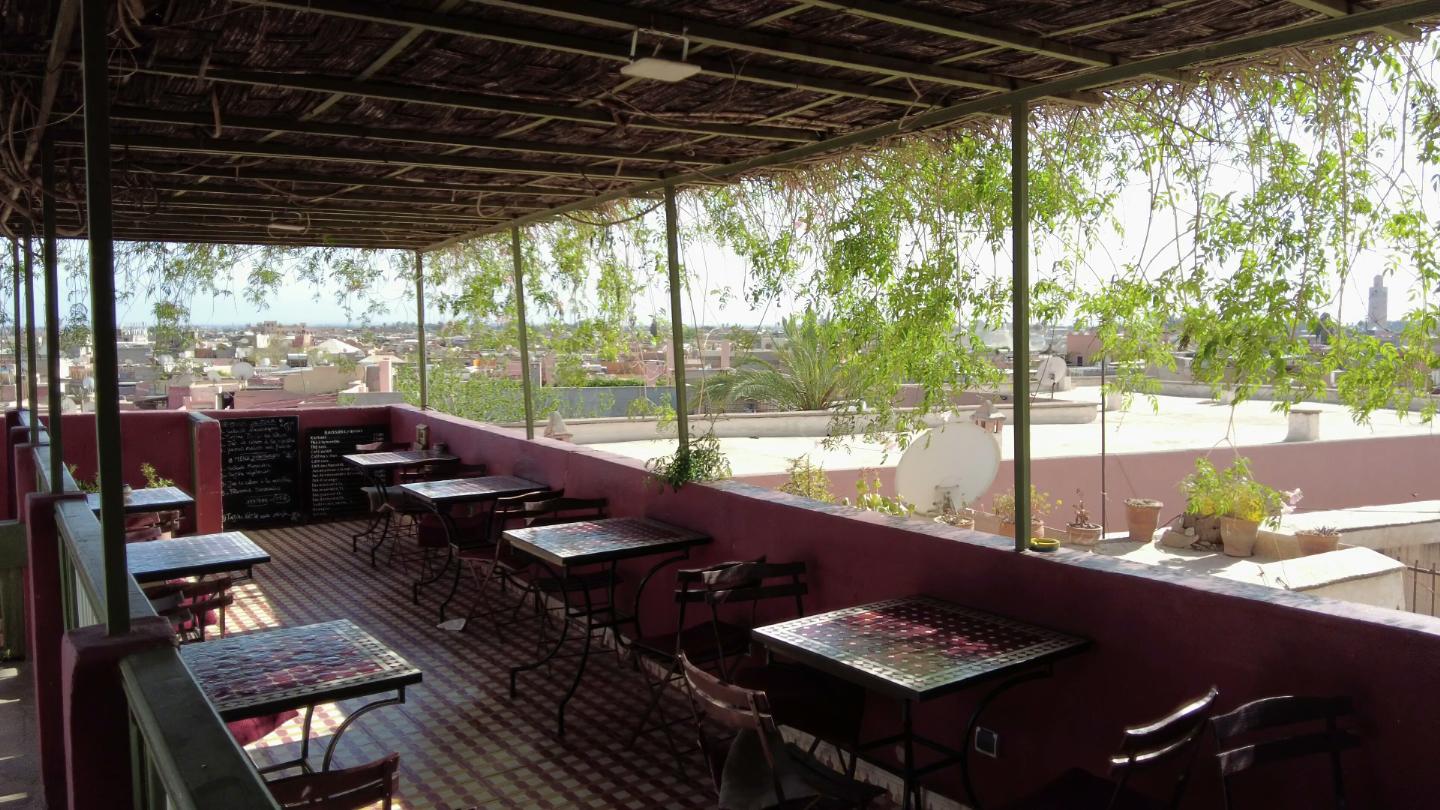 Rooftop cafe. Leaves move in the wind.