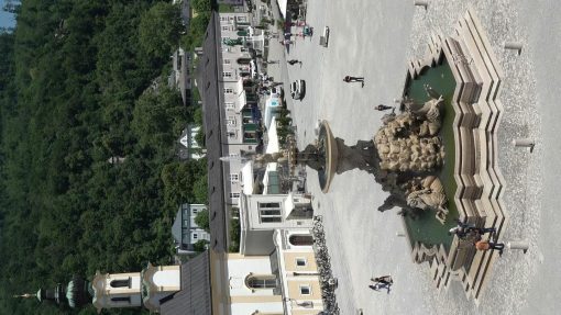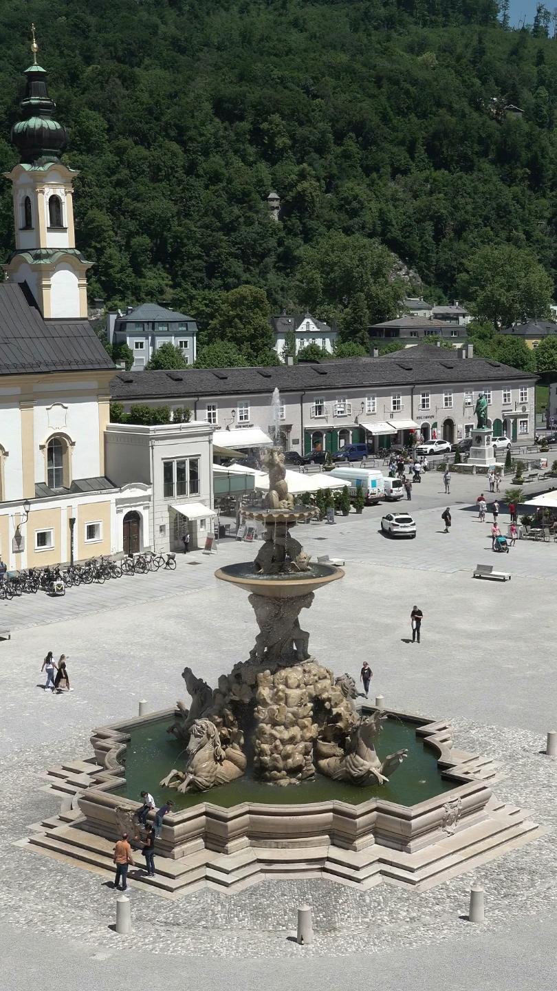 Residenzbrunnen (Residence Fountain) on Residenzplatz (Residence Square), seen from the cathedral. Residenzbrunnen is the largest baroque fountain outside of Italy. UNESCO World Cultural Heritage Site.