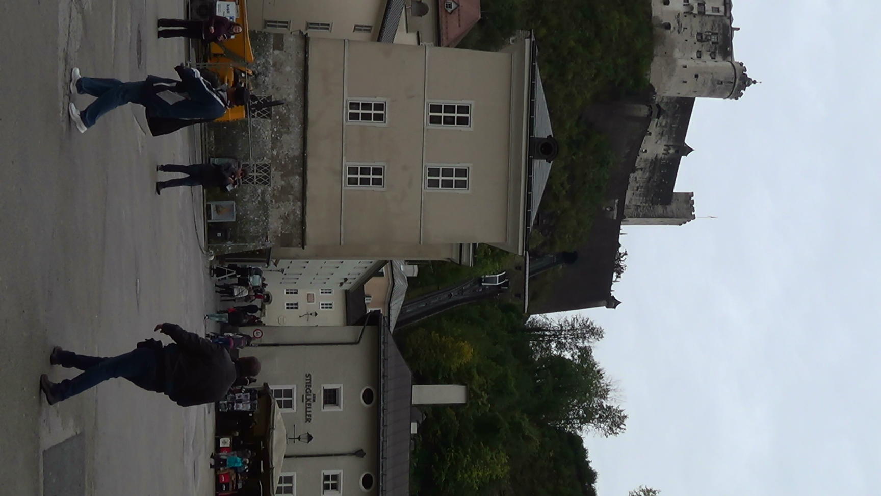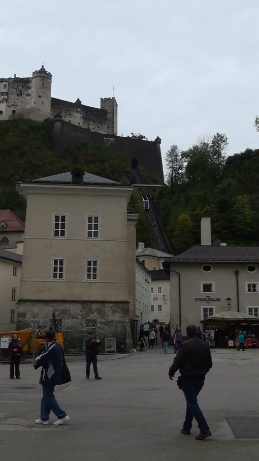Old Town, Kapitelplatz, a view towards Festungsgasse (Fortress Lane), the Fortress Funicular “Festungsbahn”, and the Fortress overlooking it all. UNESCO World Cultural Heritage Site.