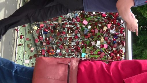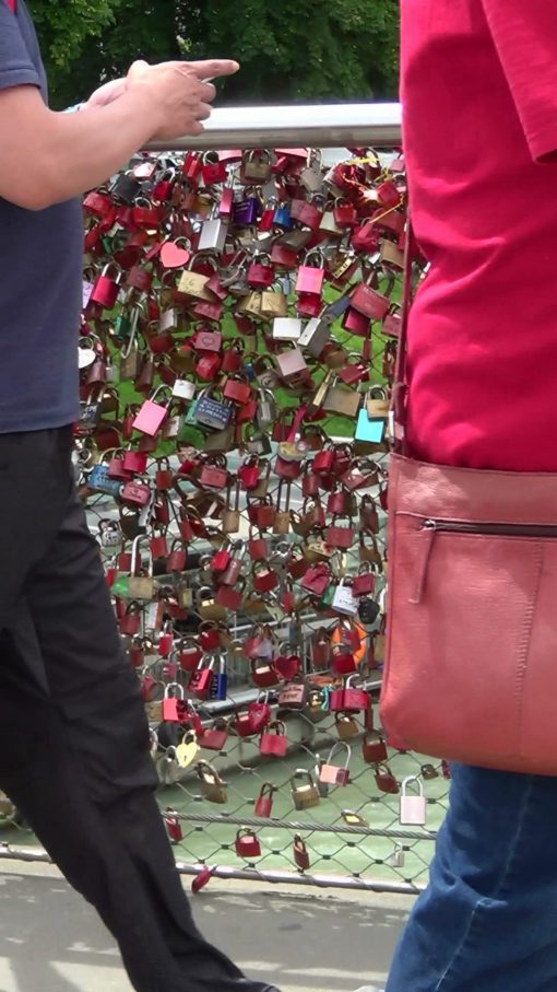Love Padlocks on Makartsteg, the new pedestrian bridge over the Salzach River. This is a panorama from the right to the left. The city of Salzburg is UNESCO World Cultural Heritage Site.