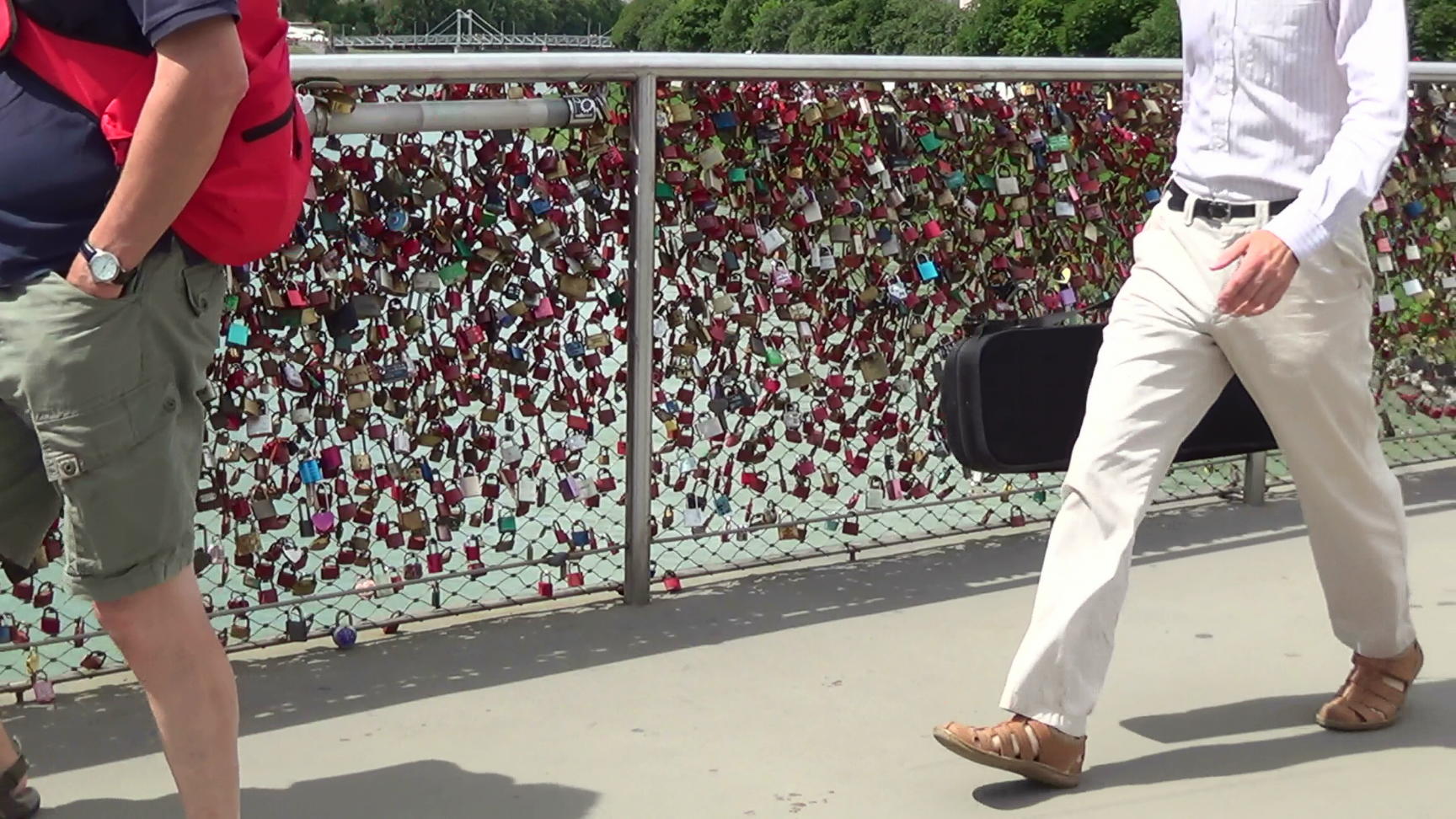 Love Padlocks on Makartsteg, the pedestrian bridge over the Salzach River.This is a panorama from the left to the right.