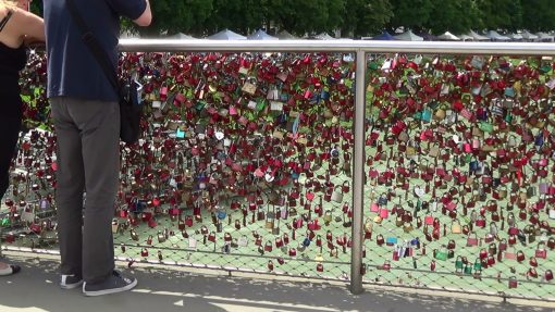 Love Padlocks on Makartsteg, the pedestrian bridge over the Salzach River.This is a panorama from the right to the left.