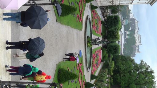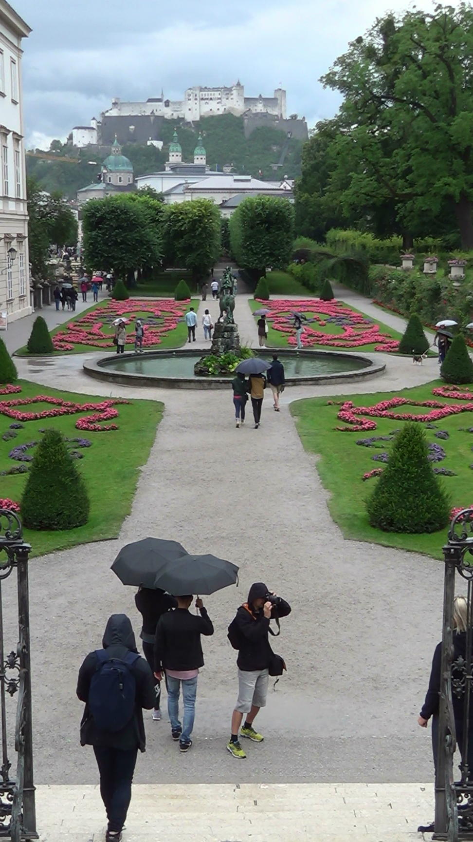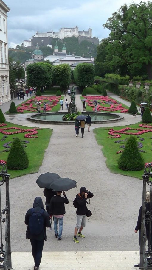 Old Town, Mirabellgarten (Mirabell Gardens). View from the “Do-Re-Mi”- stairs (yes: The Sound of Music!) to the fortress Hohensalzburg. UNESCO World Cultural Heritage Site.