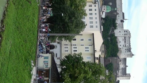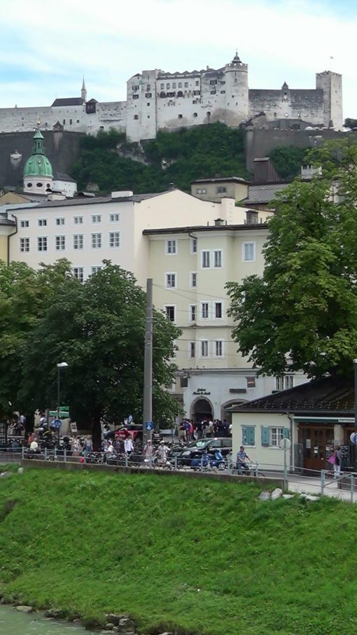 Salzach River, the Old Town, and the Fortress Hohensalzburg, seen from Makartsteg, the pedestrian bridge. This is a panorama from the right to the left. The city of Salzburg is UNESCO World Cultural Heritage Site.