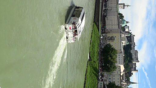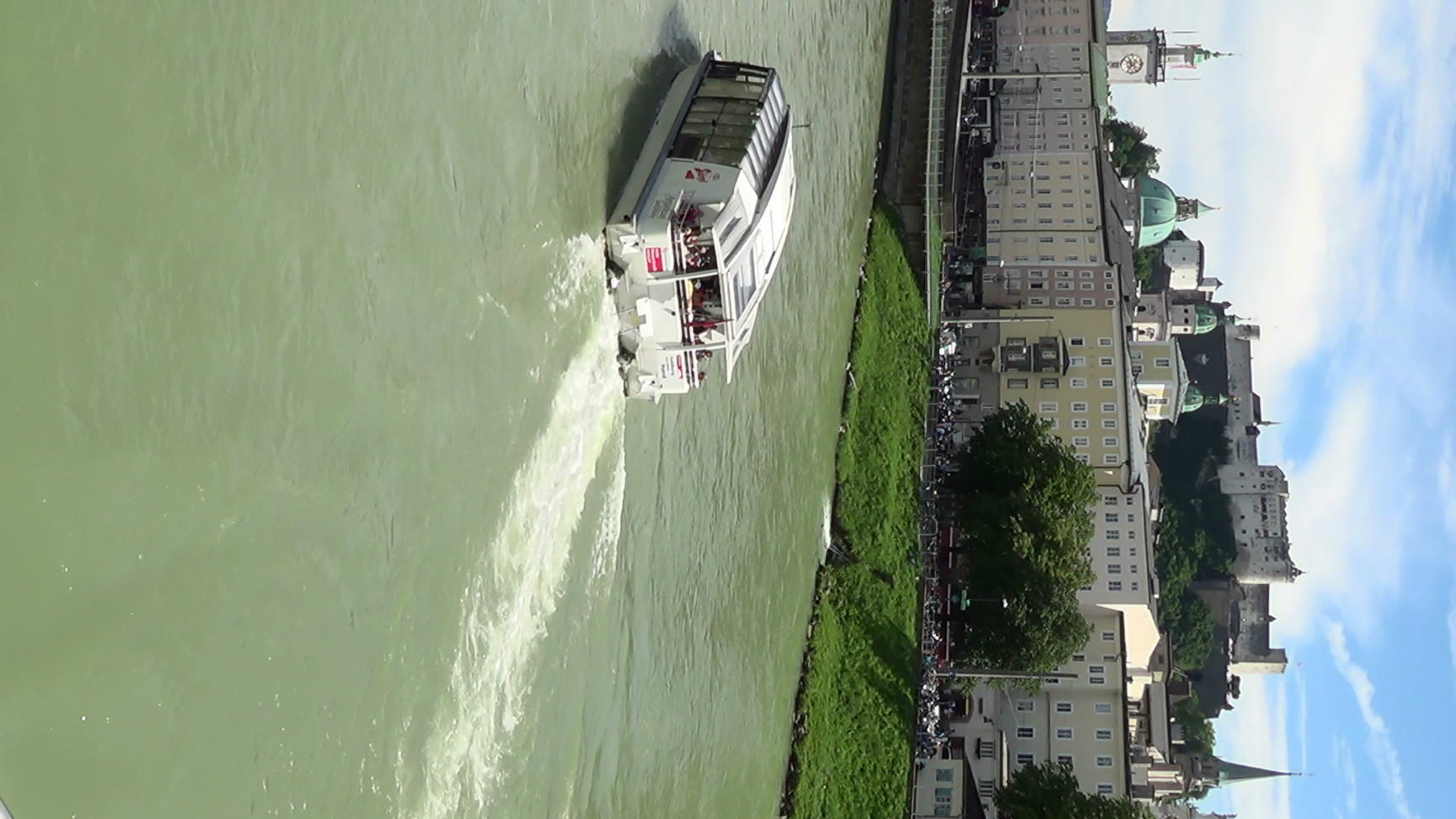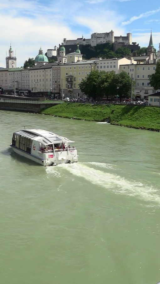 Salzach River, the Old Town and the Fortress Hohensalzburg seen from Makartsteg, the small pedestrian bridge. With river boat. Music from a street musician nearby. The city of Salzburg is UNESCO World Cultural Heritage Site.