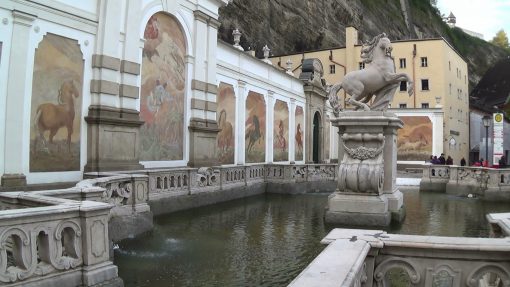 The historic horsepond “Pferdeschwemme” in the Old Town. On the pedestal “The horse tamer”. The Old Town of Salzburg is UNESCO World Cultural Heritage Site.