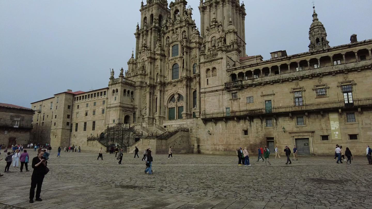 The cathedral and the central square Praza do Obradoiro. Pilgrims gather here after arrival. The Camino de Santiago is UNESCO World Cultural Heritage.