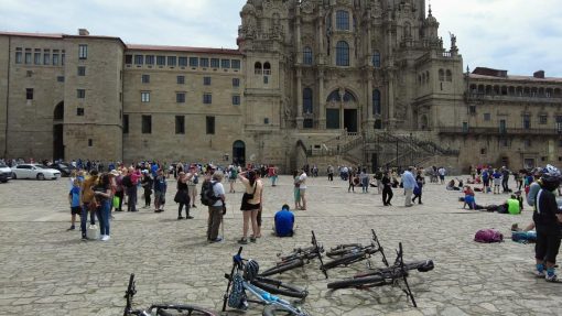 The cathedral and the central square Praza do Obradoiro. Pilgrims gather here after arrival. The Camino de Santiago is UNESCO World Cultural Heritage. This is a panorama from the right to the left.