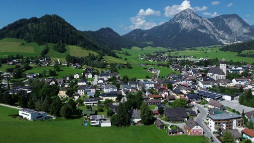 The village Gröbming in the Austrian Alps. The mountain “Stoderzinken” in the distance. This is a flight forward.