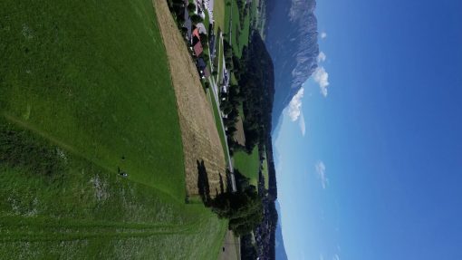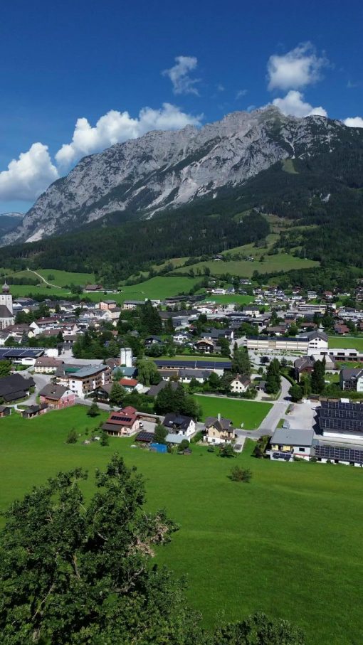 In the Enns valley in the Austrian Alps. On a hill in the village Gröbming. The mountains “Stoderzinken”, “Kammspitze” and “Grimming”, in order of appearance. This is a panorama from the left to the right.