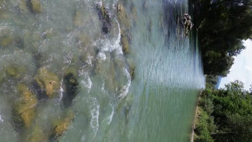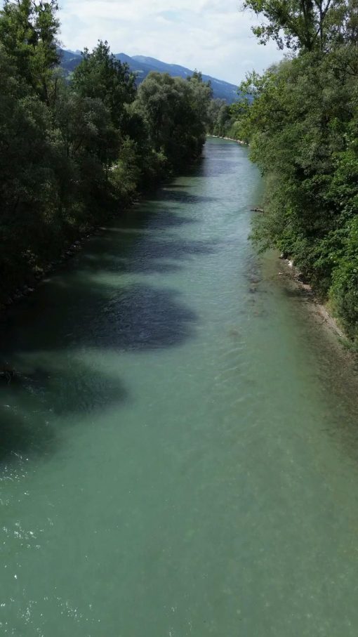 The Enns river in the Enns valley in the Austrian Alps. The water flows towards the camera. This is a flight forward + ascend.