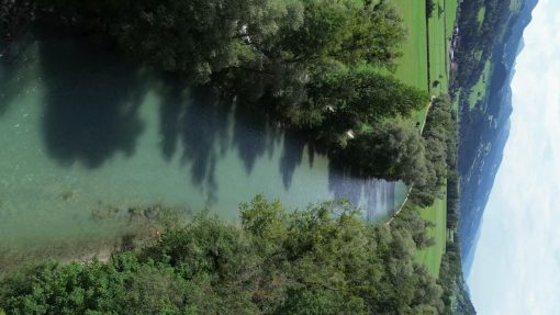 The Enns river in the Enns valley in the Austrian Alps.  The water flows towards the camera. This is a flight forward + ascend.