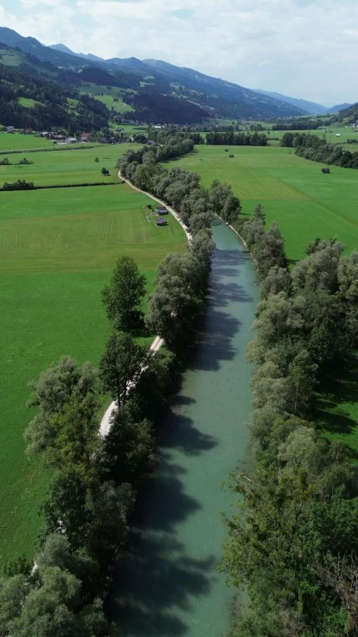 The Enns river in the Enns valley in the Austrian Alps. This is a flight forward + ascend.