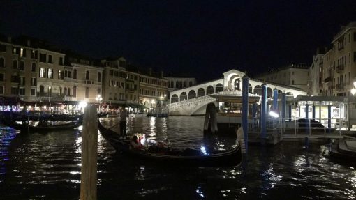 Canal Grande, Ponte Rialto and gondolas by night. Venice is UNESCO World Cultural Heritage Site.