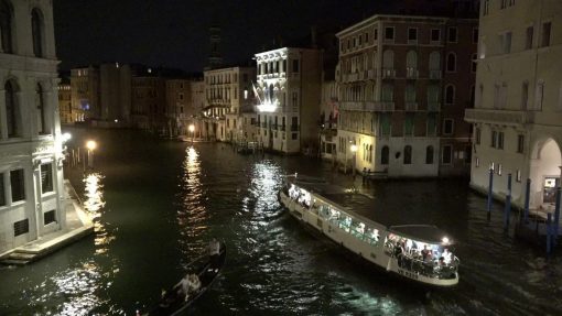 Canal Grande, seen from the Ponte Rialto (Rialto Bridge), looking northeast. A gondola and a vaporetto pass. Venice is UNESCO World Cultural Heritage Site.