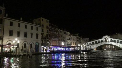 Canal Grande and Rialto Bridge, seen from the boat. Clear summer night. Venice is UNESCO World Cultural Heritage Site.