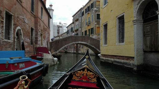 In a traditional gondola on Rio de San Agostin. Venice is UNESCO World Cultural Heritage Site.