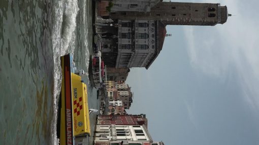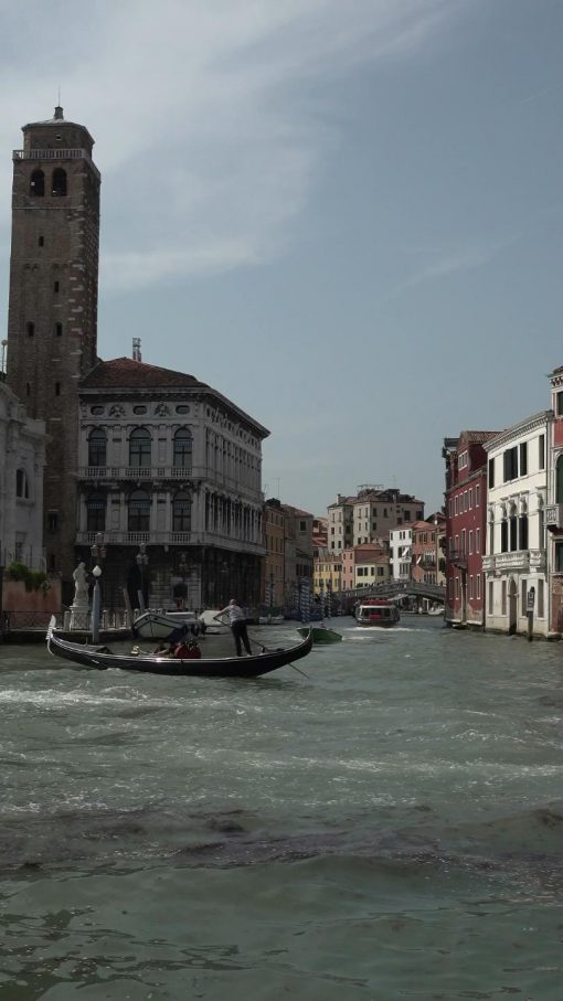 The intersection of Canal Grande and Canale di Cannaregio, east of the Santa Lucia railway station. The tower (Campanile) of Santi Geremia e Lucia on the left hand side. Venice is UNESCO World Cultural Heritage Site.
