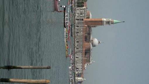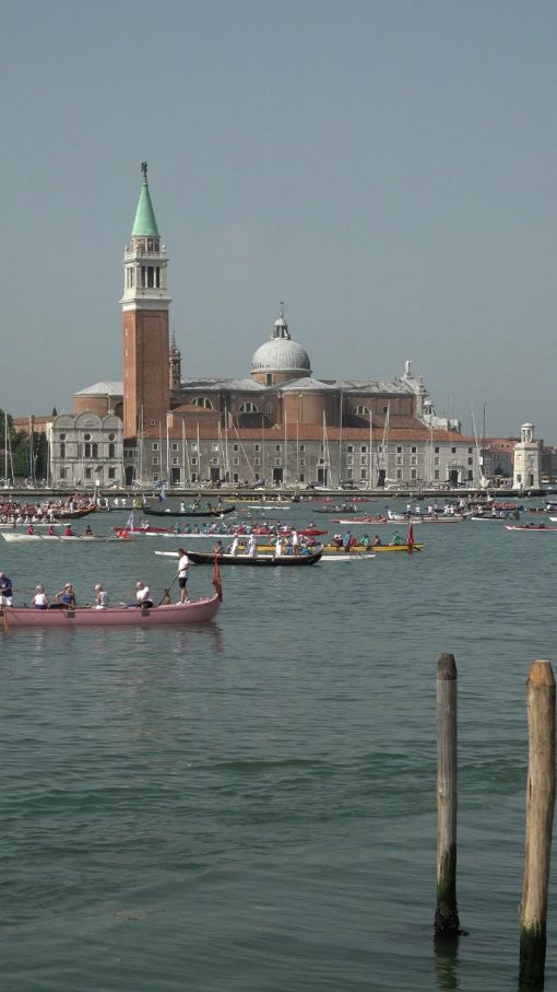 Start of the Vogalonga, the fun regatta, in the lagoon of Venice. San Giorgio Maggiore in the distance. Venice is UNESCO World Cultural Heritage Site.