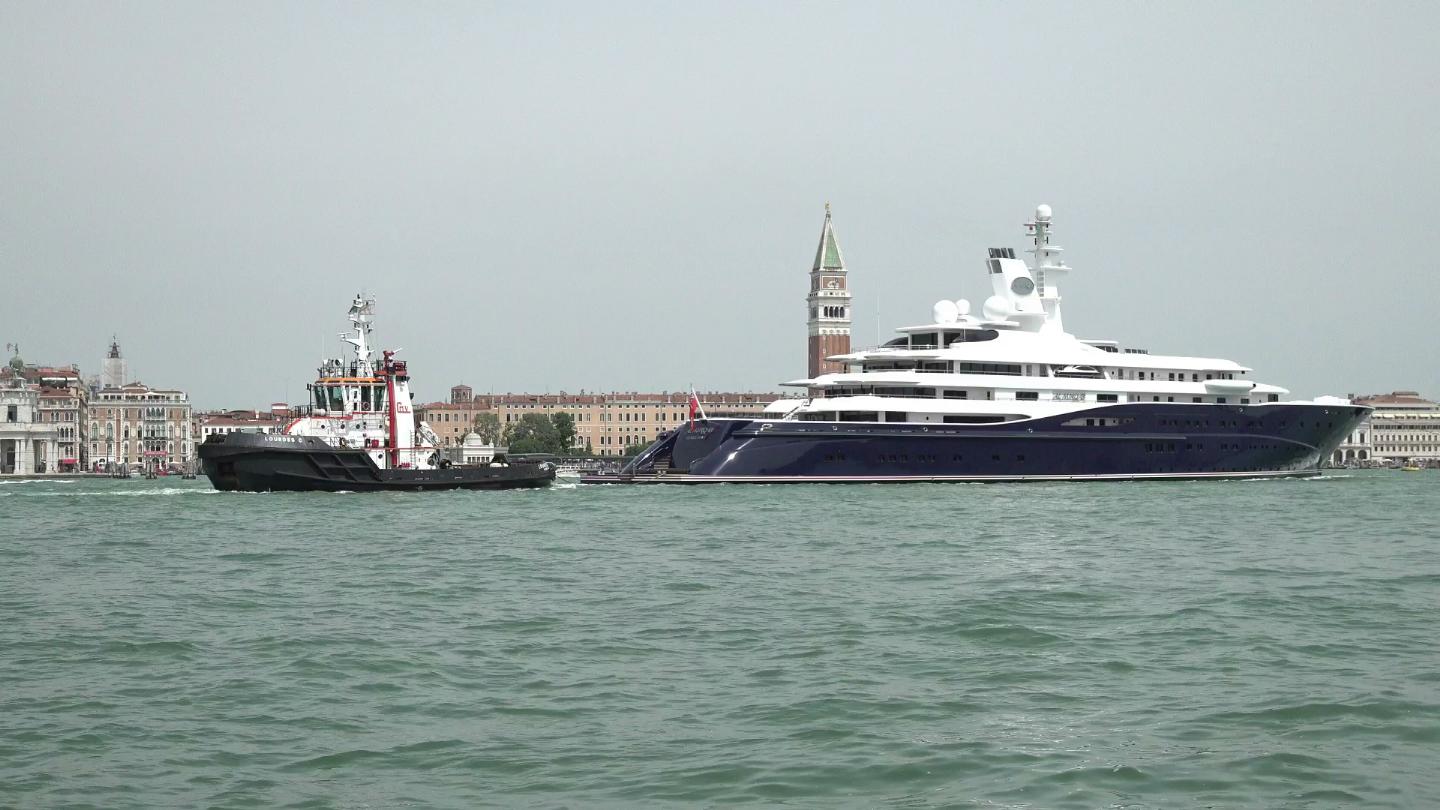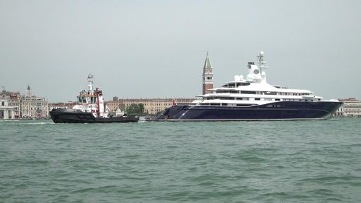 A yacht passes St. Mark’s Square and the Doges’s Palace, seen from Giudecca. Venice is UNESCO World Cultural Heritage Site.