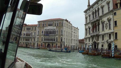 Canal Grande, seen from aboard a Vaporetto (the public transport boat). This is southwards from the station San Toma to Ca´Rezzonico. Buildings, in the order of appearance: Palazzo Balbi, Palazzo Foscari, Palazzo Giustinian, Palazzo Nani, Palazzo Rezzonico, Palazzo Contarini. Venezia is UNESCO World Cultural Heritage Site.