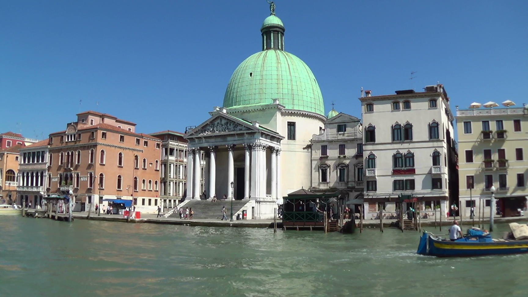 San Simeone Piccolo and the traffic on Canal Grande, seen from the square in front of the railway station Santa Lucia. This is a panorama from the left to the right. Venice is UNESCO World Cultural Heritage Site.