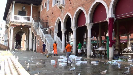The “back door” of the fish market (Mercato del Pesce), not far from the Rialto Bridge. Panorama from the right to the left.