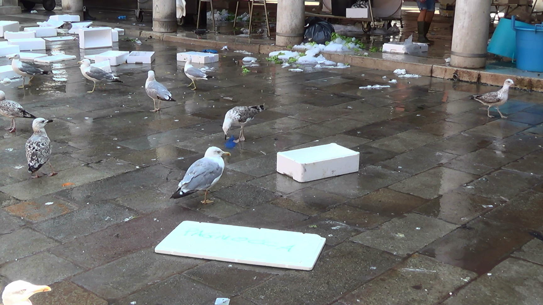 Seagulls at the “back door” of the fish market (Mercato del Pesce), not far from the Rialto Bridge.