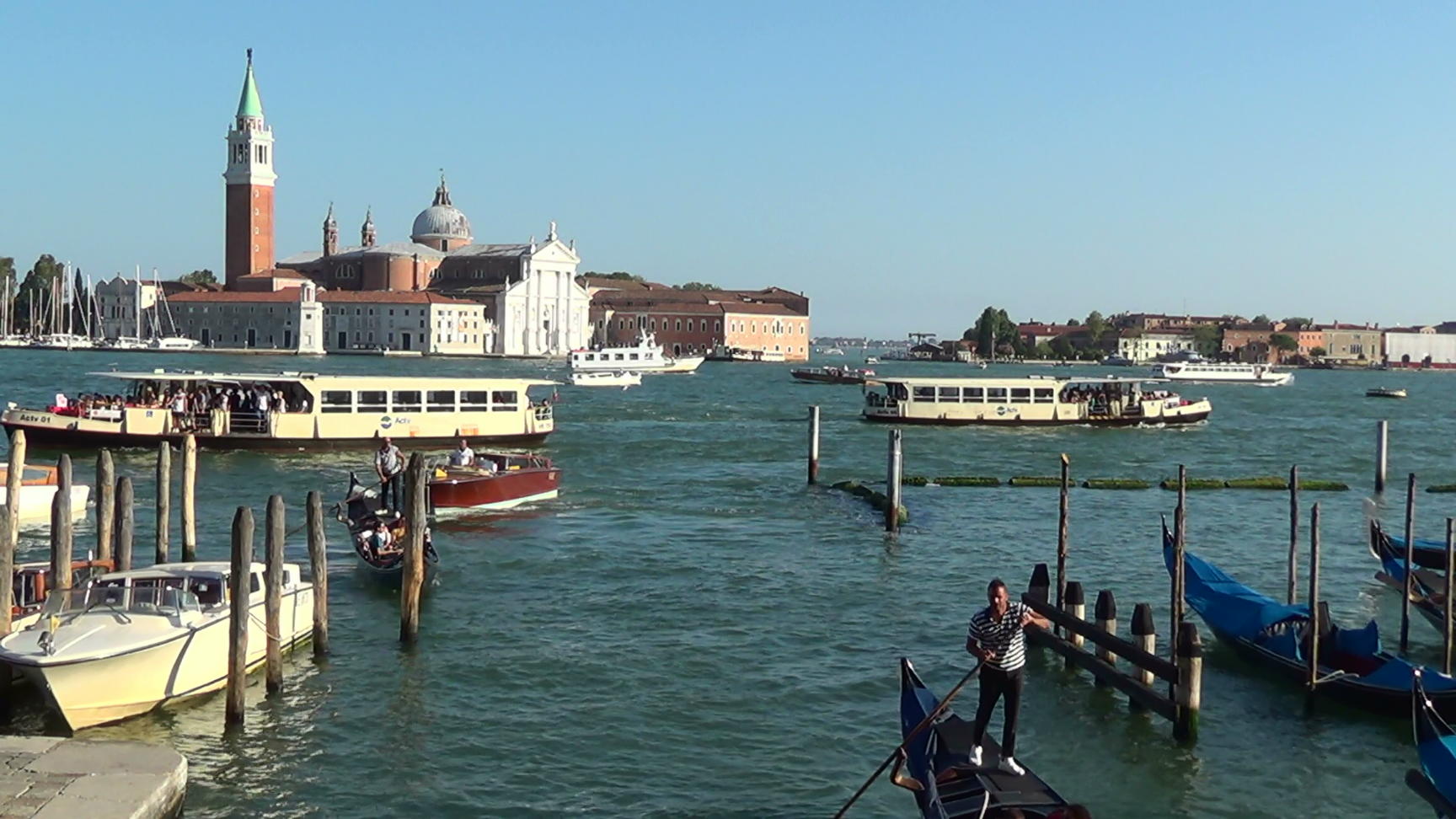 The lagoon in the evening sun, seen from the Ponte della Paglia (near the Bridge of Sighs). San Giorgio Maggiore is in the distance. Venice is UNESCO World Cultural Heritage Site.