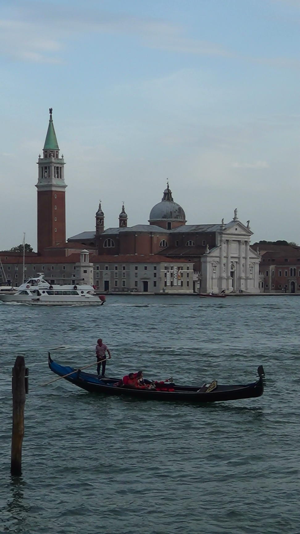 Венеция, Италия. Движение судов в лагуне, вид с Понте-делла-Палья (возле моста Вздохов). Сан-Джорджо Маджоре на заднем плане. Венеция является объектом Всемирного культурного наследия ЮНЕСКО. Вертикальный размер.