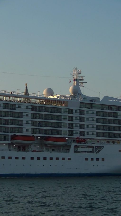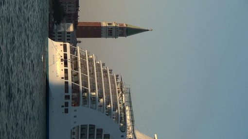 A cruise liner passes the Campanile, the St. Mark’s Square, and the Doges’s Palace. Venice is UNESCO World Cultural Heritage Site.