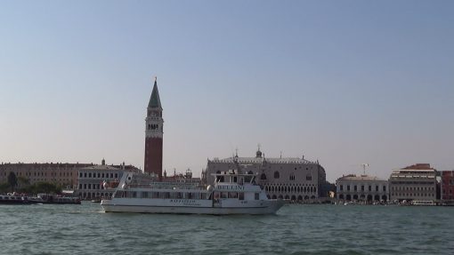 Traffic in the lagoon in front of Campanile, the St. Mark’s Square, and the Doges’s Palace, seen from San Giorgio Maggiore. Venice is UNESCO World Cultural Heritage Site.
