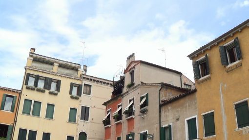 Town houses on Campo San Stin in the old town of San Polo. UNESCO World Cultural Heritage Site. This is a panorama from the left to the right.