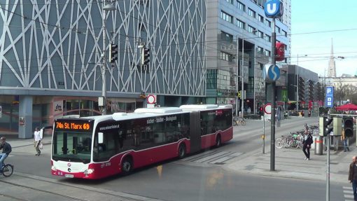 Everyday life at the public transport hub and station area “Wien Mitte” in the 3rd district, seen through a window. To the left the Village Cinemas building, in the background the Hilton Hotel Vienna, far away the tower of the St. Stephens Cathedral. This take is closer to the scene than the video no. 94735 and the video no. 89519. Reflections of some interior in the window.