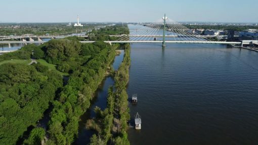Danube River and the fishermen´s floating cabins. This is a flight forward.