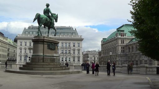 The entrance to the Albertina Museum is located on a raised terrace, with the statue of Archduke Albrecht on it. This is a panorama from the left to the rigth. State Opera House and Hotel Sacher in the background. The Old Town of Vienna is UNESCO World Cultural Heritage Site.