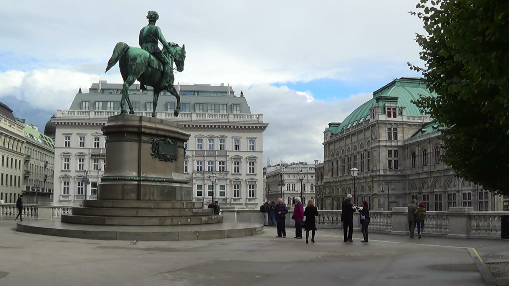 The entrance to the Albertina Museum is on a raised terrace, with the statue of Archduke Albrecht on it. Panorama from the left to the right. State Opera House and Hotel Sacher in the background.