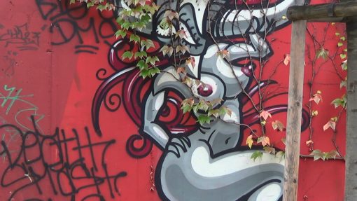 A sprayed container wall at Arena, the venue in the former slaughterhouse area. Zoom out.