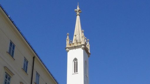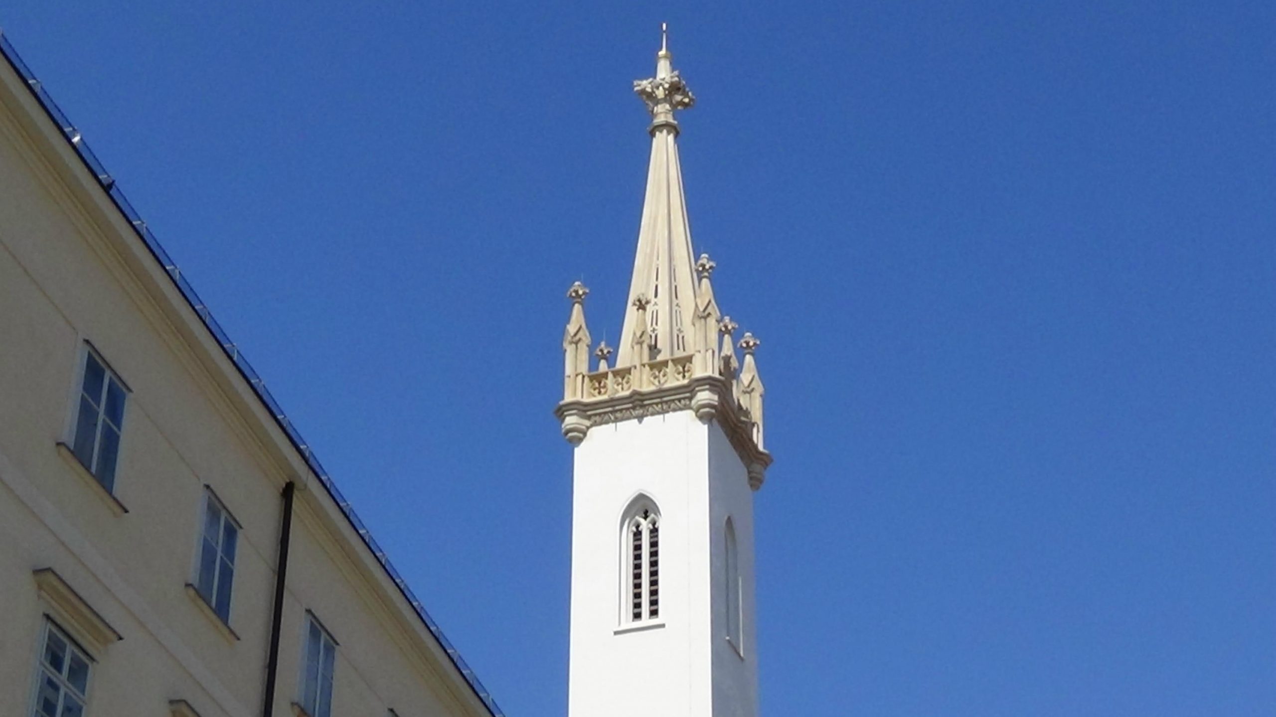 The easter bells of the Augustinerkirche in the old town. Augustinerkirche is a small church within the Hofburg complex, nearly invisible from the outside. The hanging bell body is being moved and hits the clapper that hangs within, unmoved.