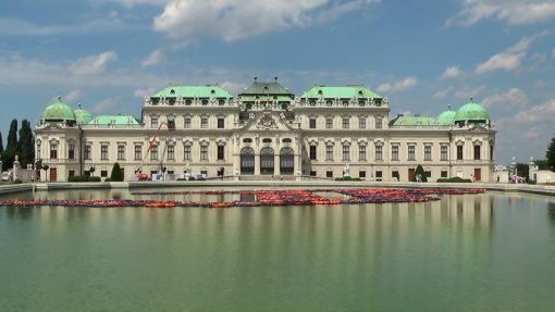 Belvedere, at the pool on the upper level. Panorama from the right to the left, from the park to the palace. UNESCO World Cultural Heritage Site.