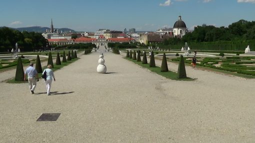 Belvedere, a view from the palace to the park and the city skyline beyond. Panorama from the left to the right. Belvedere is UNESCO World Cultural Heritage Site.